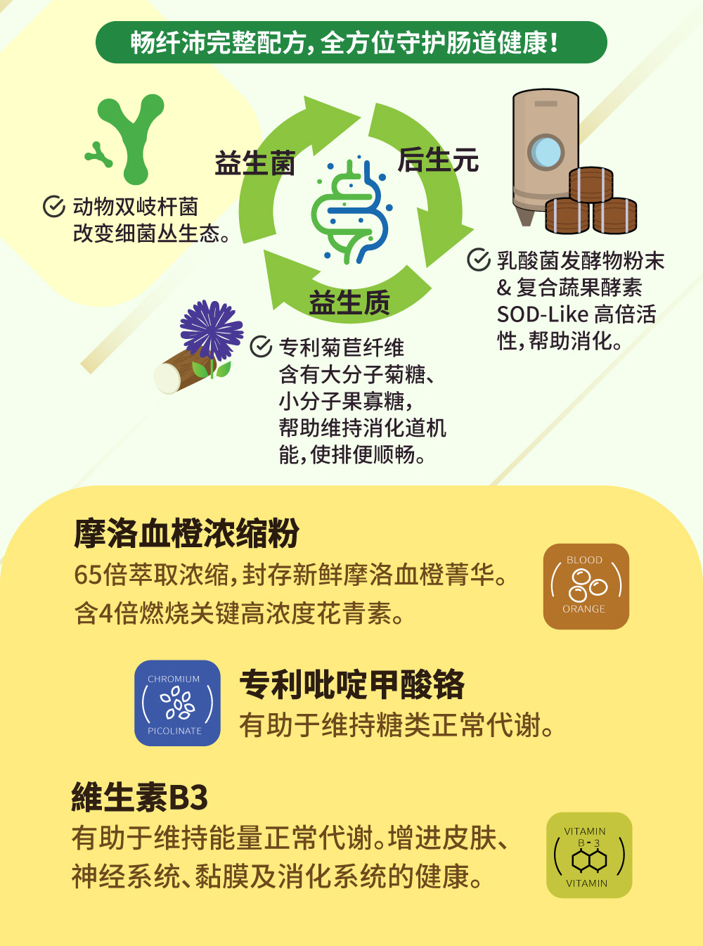 益生質: 專利菊苣纖維 含有大份子菊糖 小份子果寡糖 有助維持消化道機能 使您排便順暢