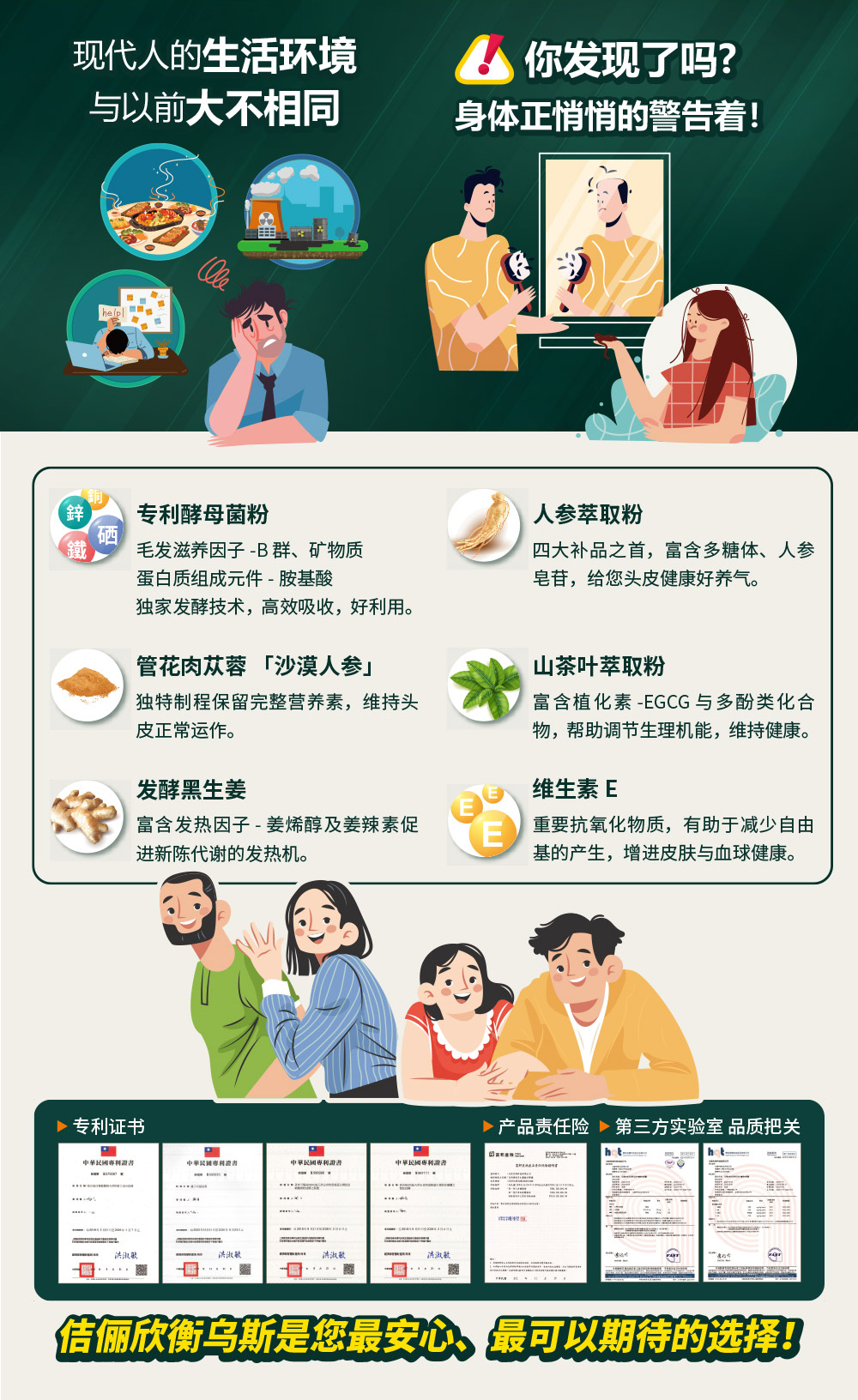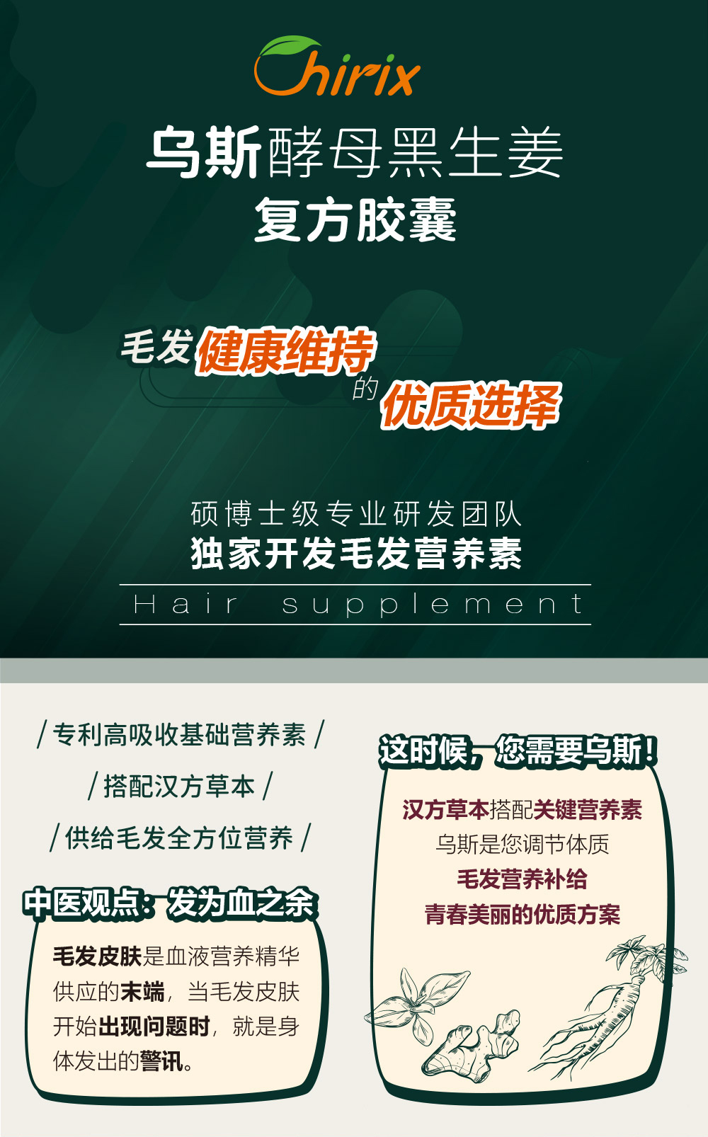 烏斯酵母黑生薑複方膠囊是由食品生技博士獨家研發 調節生理機能 補給頭皮營養 強韌髮絲 維持頭皮健康